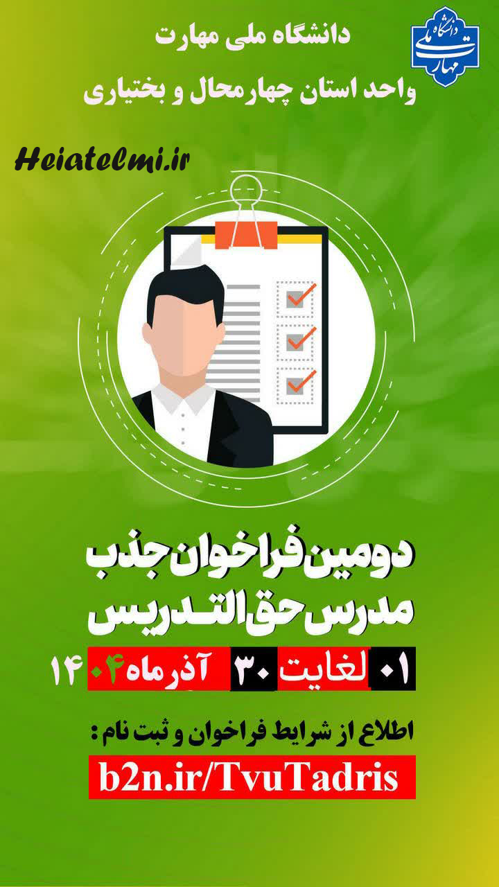 دانشگاه ملی مهارت استان چهارمحال و بختیاری برای سال ۱۴۰۴ مدرس حقالتدریس جذب میکند.