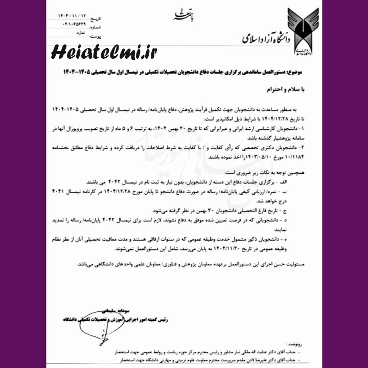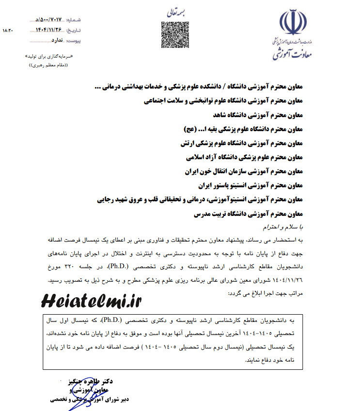 طبق این اطلاعیه همچنین دانشجویان دکتری تخصصی که رأی کفایت یا کفایت با اصلاحات دریافت کردهاند، مجاز به برگزاری جلسه دفاع تا تاریخ مذکور هستند.